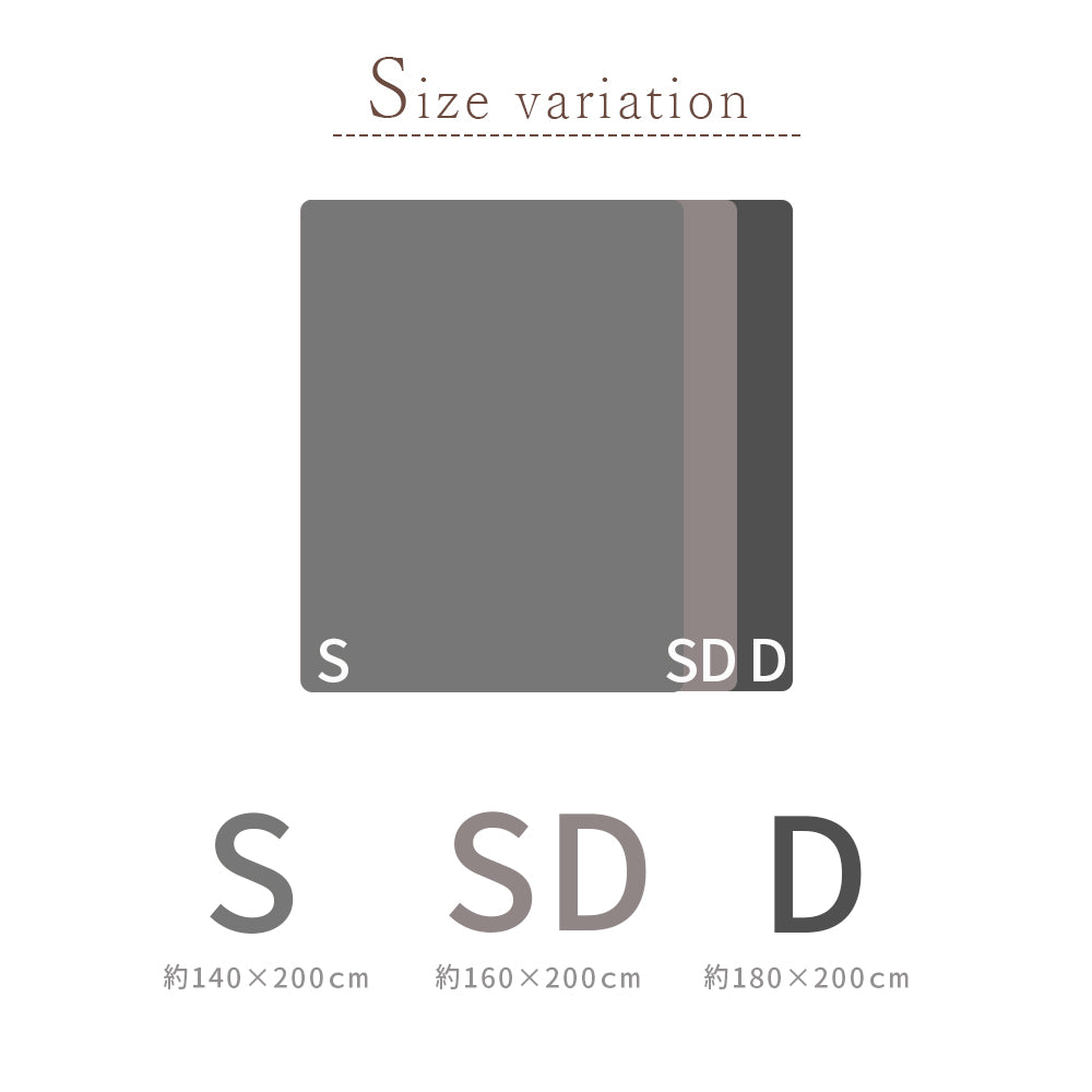 | サイズ | シングル 約140×200cm 約2.4kg セミダブル 約160×200cm 約2.7kg ダブル 約180×200cm 約3.1kg |